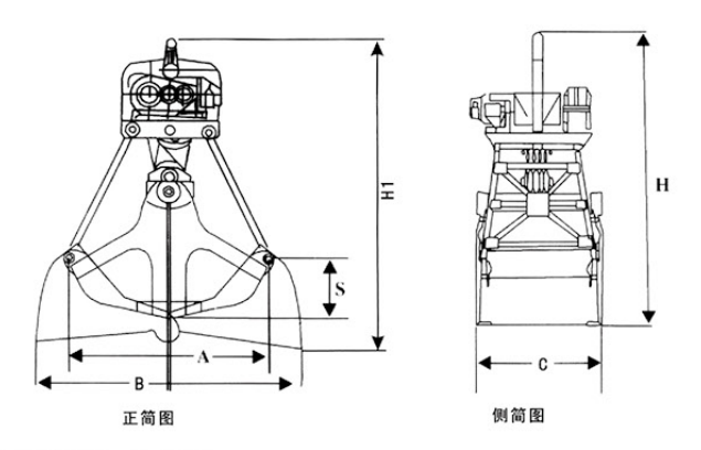 電動(dòng)馬達(dá)抓斗本身帶有閉合機(jī)構(gòu),它的樣式繁多,我公司是把標(biāo)準(zhǔn)的電動(dòng)葫蘆或卷揚(yáng)機(jī)裝到抓斗上作為開閉機(jī)構(gòu)。馬達(dá)抓斗可以看作是把閉合卷筒移到抓斗本身上去。由于馬達(dá)抓斗在閉合時(shí)不再像四繩抓斗那樣受閉合繩向上的拉力,抓斗自重全部起挖掘作用,因抓取能力大,最適用于抓取礦石等物料。