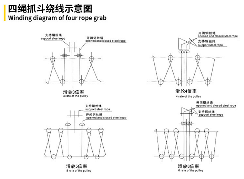 在各類起重機(jī)上,配有兩組電機(jī)卷筒(即電動葫蘆),每組卷筒引出兩根鋼絲繩,其中兩根組成一組分別生根在抓斗平衡架端作支持用,另一組鋼絲繩經(jīng)過上橫梁的滑輪與下橫梁的滑輪,組成滑輪組,起開閉斗部作用。