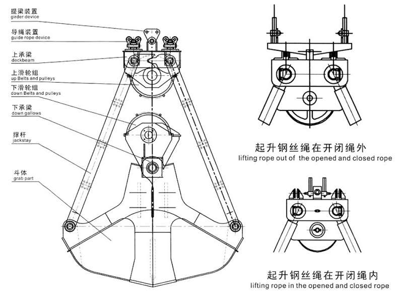 工作開始時,支持鋼絲繩將抓斗起吊在適當(dāng)?shù)奈恢蒙,然后放下開閉鋼絲繩,這時靠下橫梁的自重迫使斗部以下橫梁大軸為中心將斗部打開,當(dāng)斗部開到兩耳板的碰塊相撞時,即斗部打開到最大極限。開斗時,上橫梁滑輪和下橫梁滑輪中心距加大,然后支持鋼絲繩落下,將已打開的抓斗,落在要抓取的松散堆積物上面,再收繞開閉鋼絲繩,將上橫梁滑輪與下橫梁滑輪的中心距恢復(fù)到原來的位置,這樣就完成了抓取物料的過程。在閉合的斗部里已經(jīng)裝滿了物料,最后同時提升開閉和支持鋼絲繩,整個抓斗即被吊起,經(jīng)起重機(jī)移動到所需卸料場地上,開斗卸下所抓取的物料。