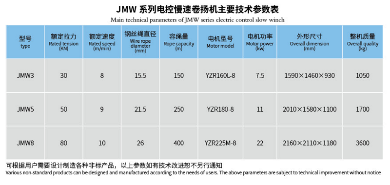 JMW系列慢速卷揚機主要用于各種大型、特大型鋼結構及鋼索、鋼纜的長距離牽引及大型程起吊,其特點鋼絲速度恒定,起吊平穩(wěn)。適用于各種橋梁、港口、碼頭等路橋施工及大型廠礦、電力工程設備安裝?梢酝ㄟ^修改用于船上。它以電動機為動力,經彈性聯(lián)軸節(jié),三級封閉式齒輪減速箱,牙嵌式聯(lián)軸節(jié)驅動卷筒,采用電磁制動。該產品通用性高、結構緊湊、體積小、重量輕、起重大、使用轉移方便,被廣泛應用于建筑、水利工程、林業(yè)、礦山、碼頭等的物料升降或平拖,還可作現(xiàn)代化電控自動作業(yè)線的配套設備。JM系列為齒輪減速機傳動卷揚機。適用于建筑安裝公司、礦區(qū)、工廠的土木建筑及安裝工程。