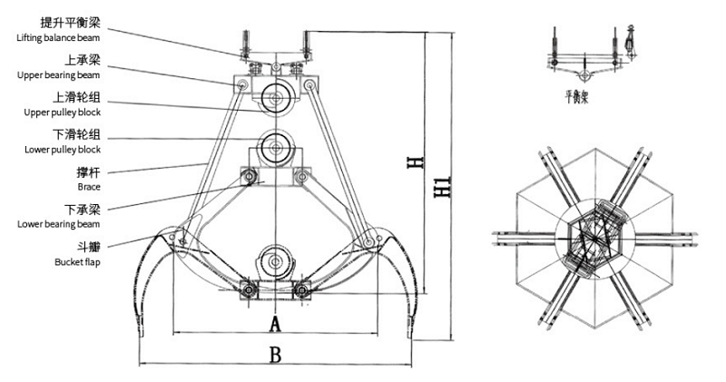 多瓣抓斗(是機械多瓣抓斗的簡稱)是配在起重機下,通過控制起重機鋼絲繩的上升與