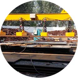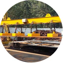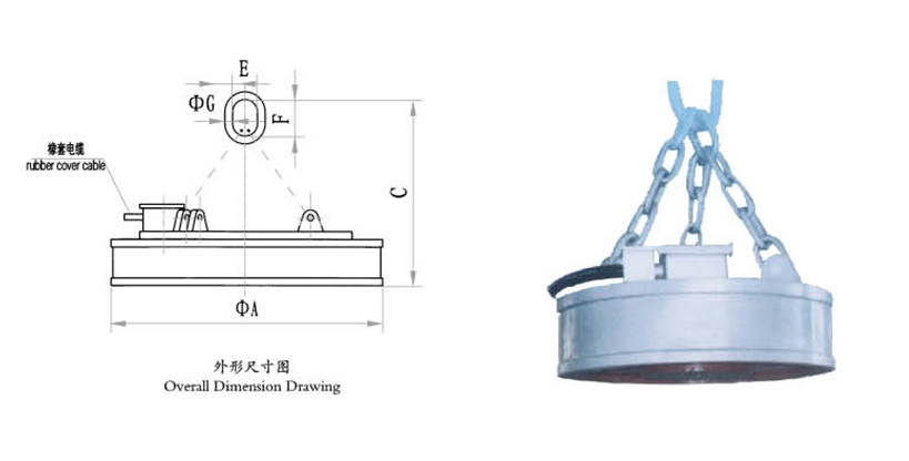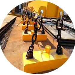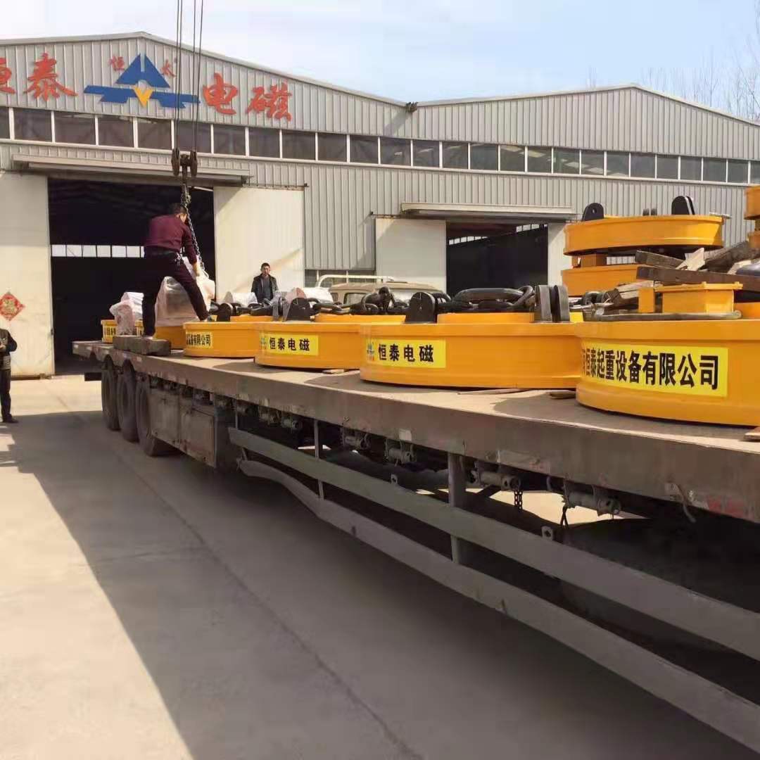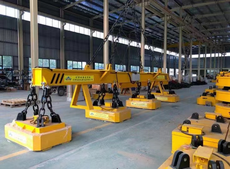 根據(jù)整塊鋼板導(dǎo)磁率大的特性,具有自重輕,吸力大的特點。用于吸吊大型鋼錠,連鑄板坯,厚鋼板。