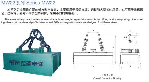 本系列為應(yīng)用最廣泛的長方形電磁鐵,主要適用于吊運(yùn)方坯,鋼錠和大型初軋坯等,也可適用于吊運(yùn)圓坯,型鋼等。針對不同類型的鋼材,采用不同的磁路設(shè)計(jì)。